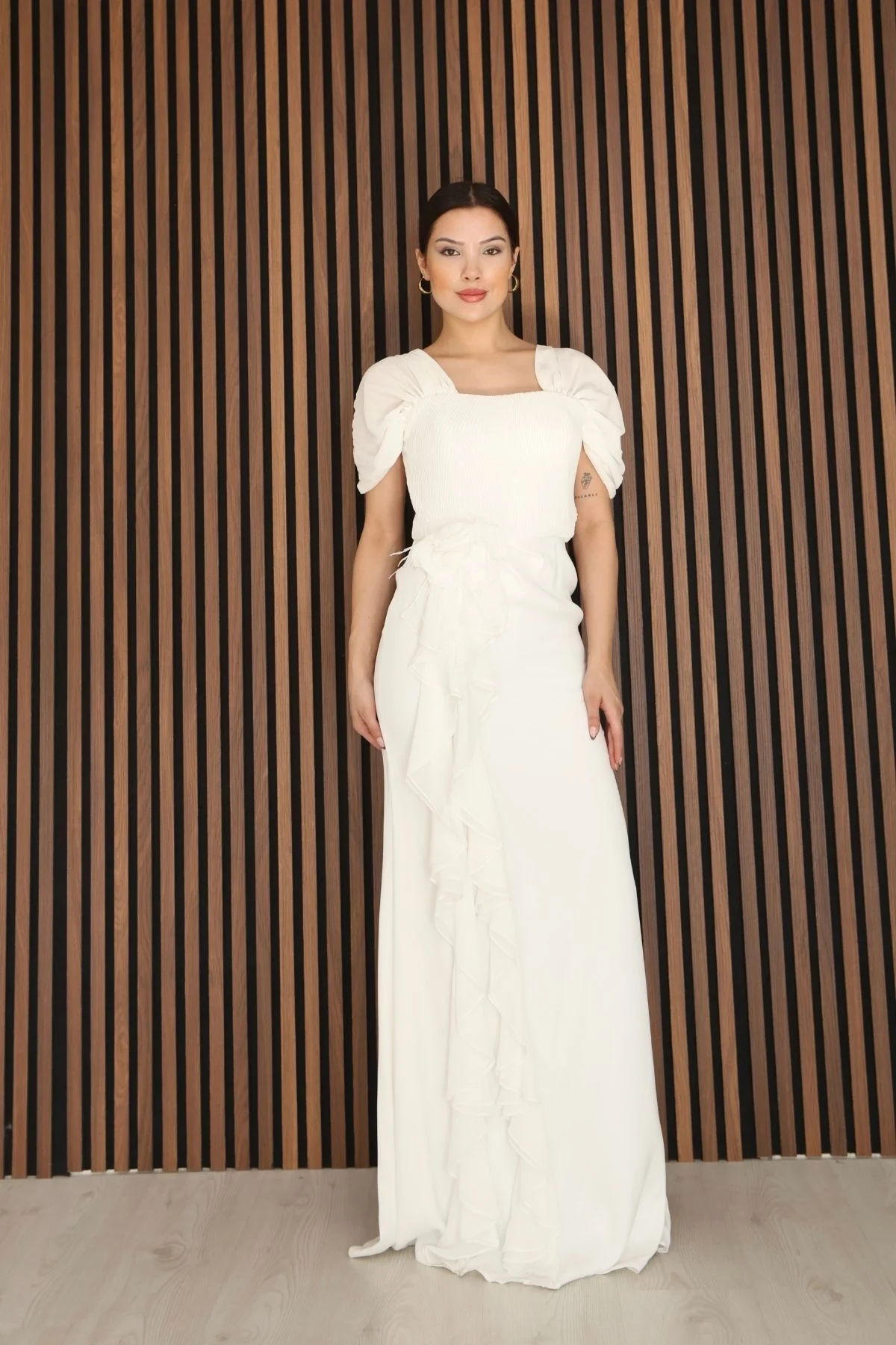 Piliseli ve Şifon Detaylı Uzun Abiye Elbise 2391-Beyaz
