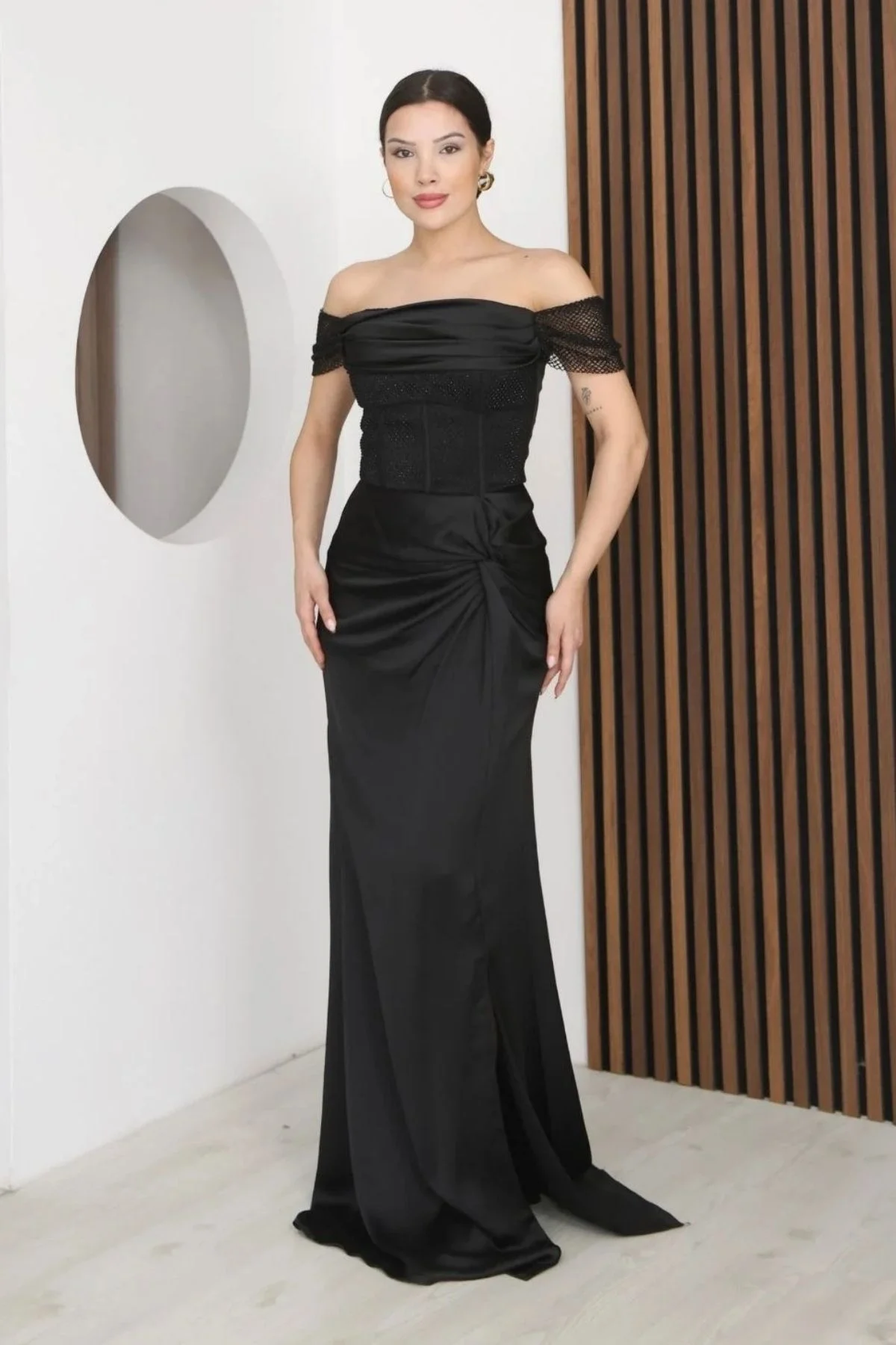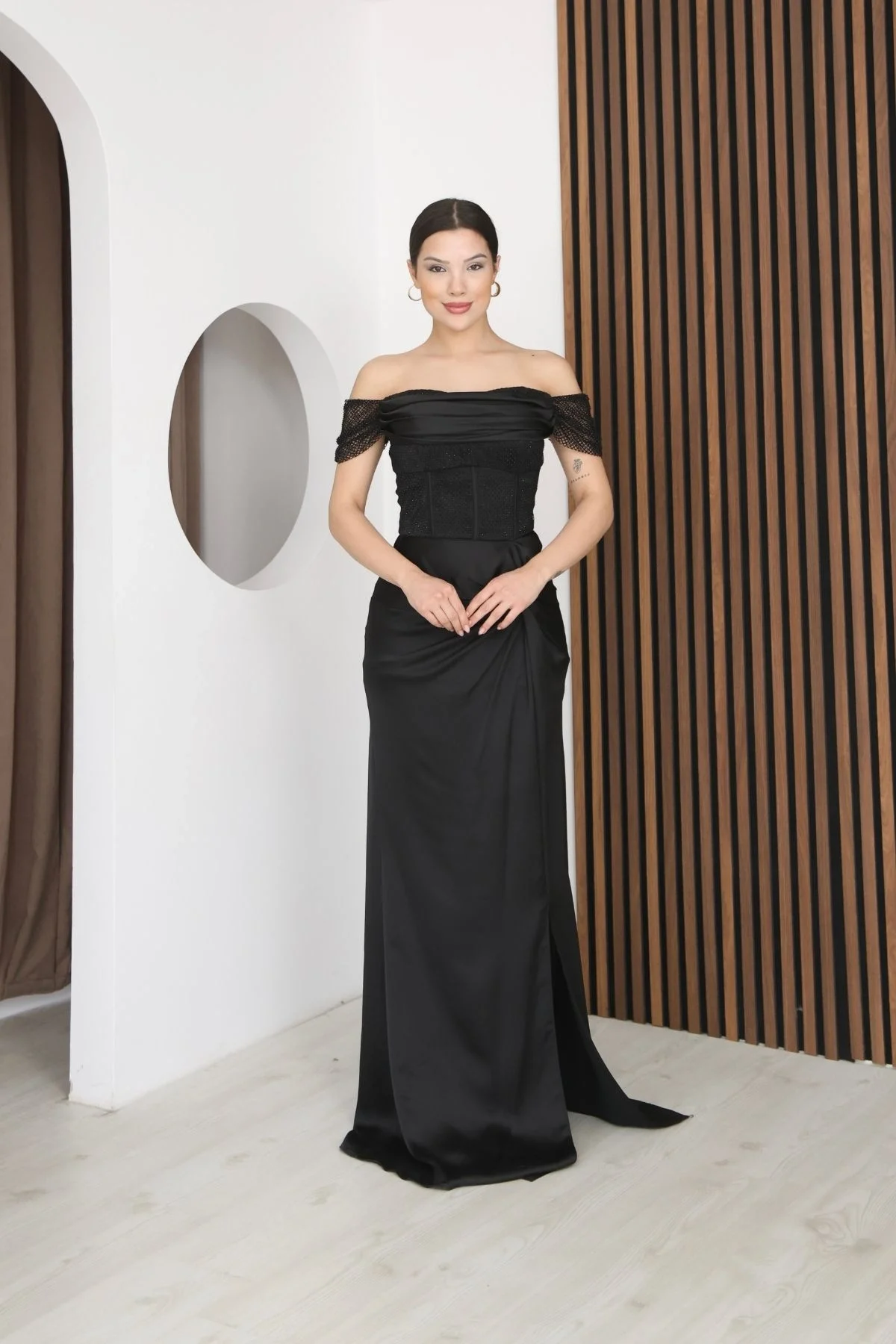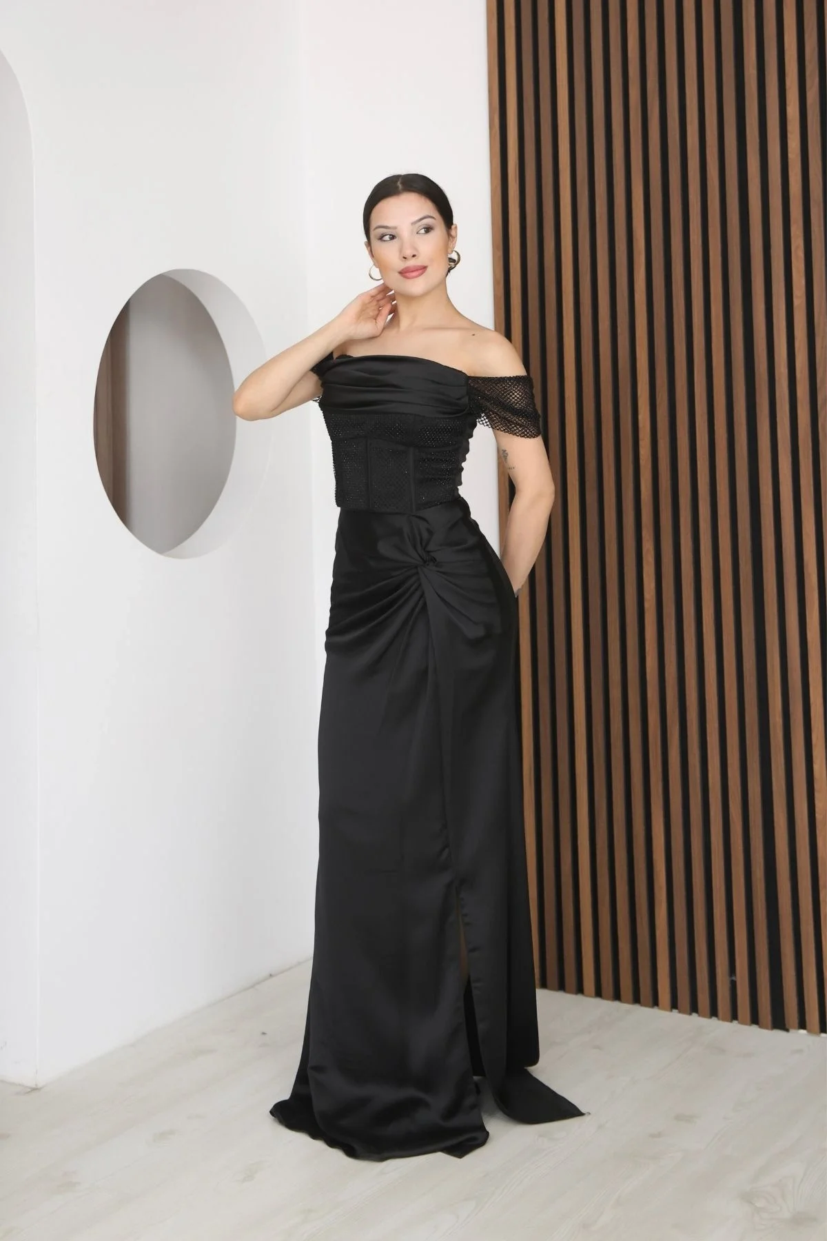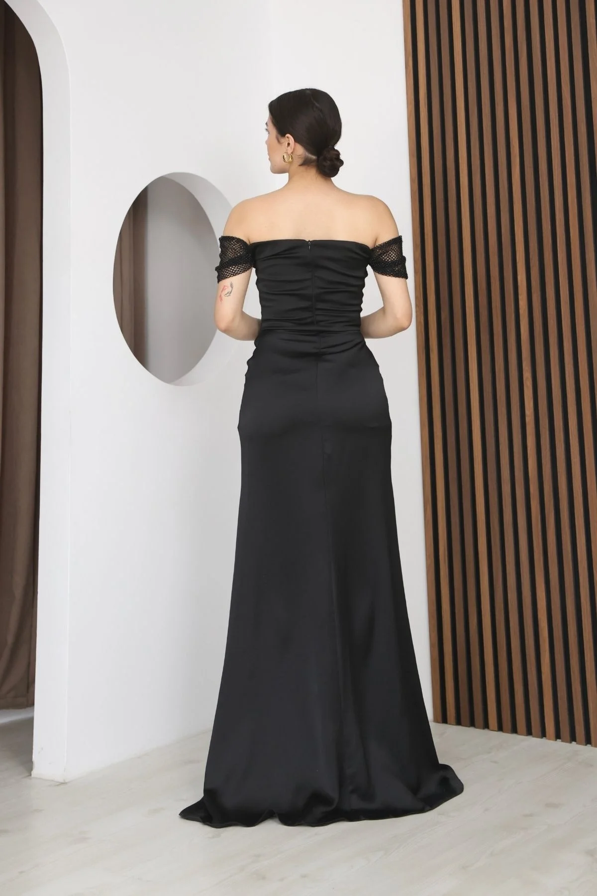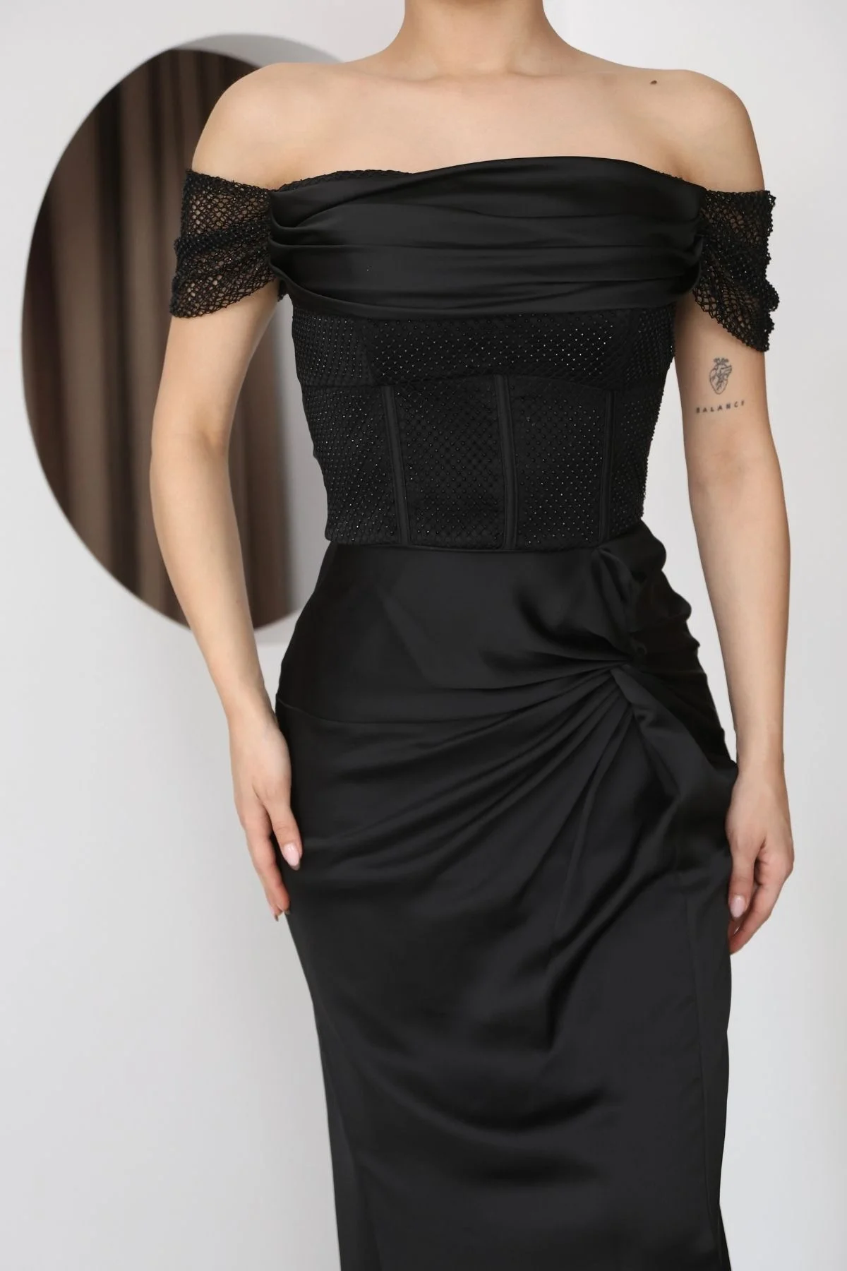 Straplez Yaka File ve Bel Detaylı Saten Abiye Elbise, Lüks saten kumaşın asil parlaklığı, silüetinizi zarifçe sararken, yalın straplez yaka omuz hatlarınızı ortaya çıkarır. Ustaca eklenmiş narin file detaylar, tasarıma gizemli ve sofistike bir dokunuş katar. Özellikle vurgulanan bel bölgesi ise vücut formunu mükemmel bir şekilde şekillendirir. Galalardan düğünlere, en özel gecelerinizde unutulmaz bir izlenim bırakmanız için tasarlandı.