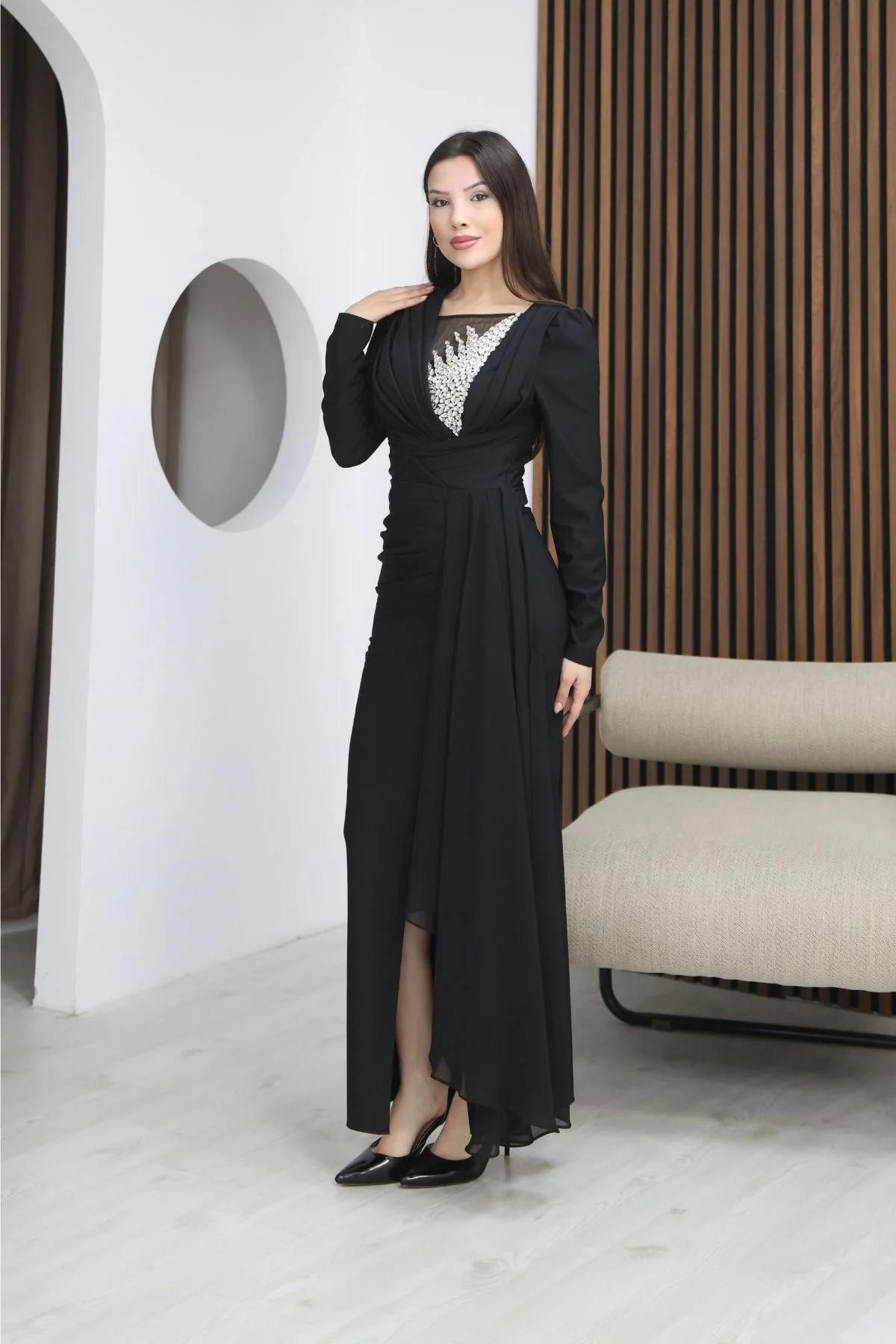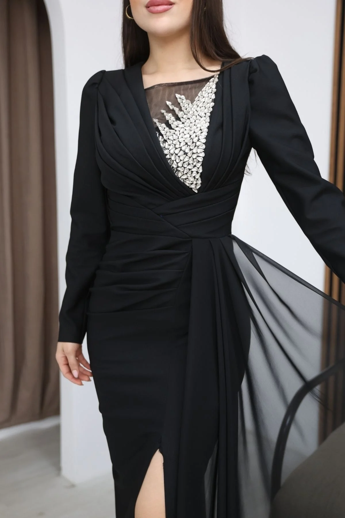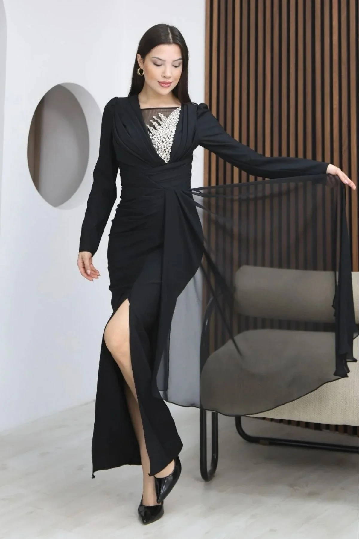 Taş İşlemeli ve Pile Detaylı Pelerinli Abiye Elbise göğüs kısmındaki taş işlemeli detay elbiseye ışıltılı ve seçkin bir hava katarken, bel ve gövde bölümündeki drapeler vücut hatlarını daha ince ve zarif gösterir. Yan kısımdan dökülen şifon detayı ve yırtmaç tasarımı ise elbiseye hem hareket hem de romantik bir akış kazandırır.