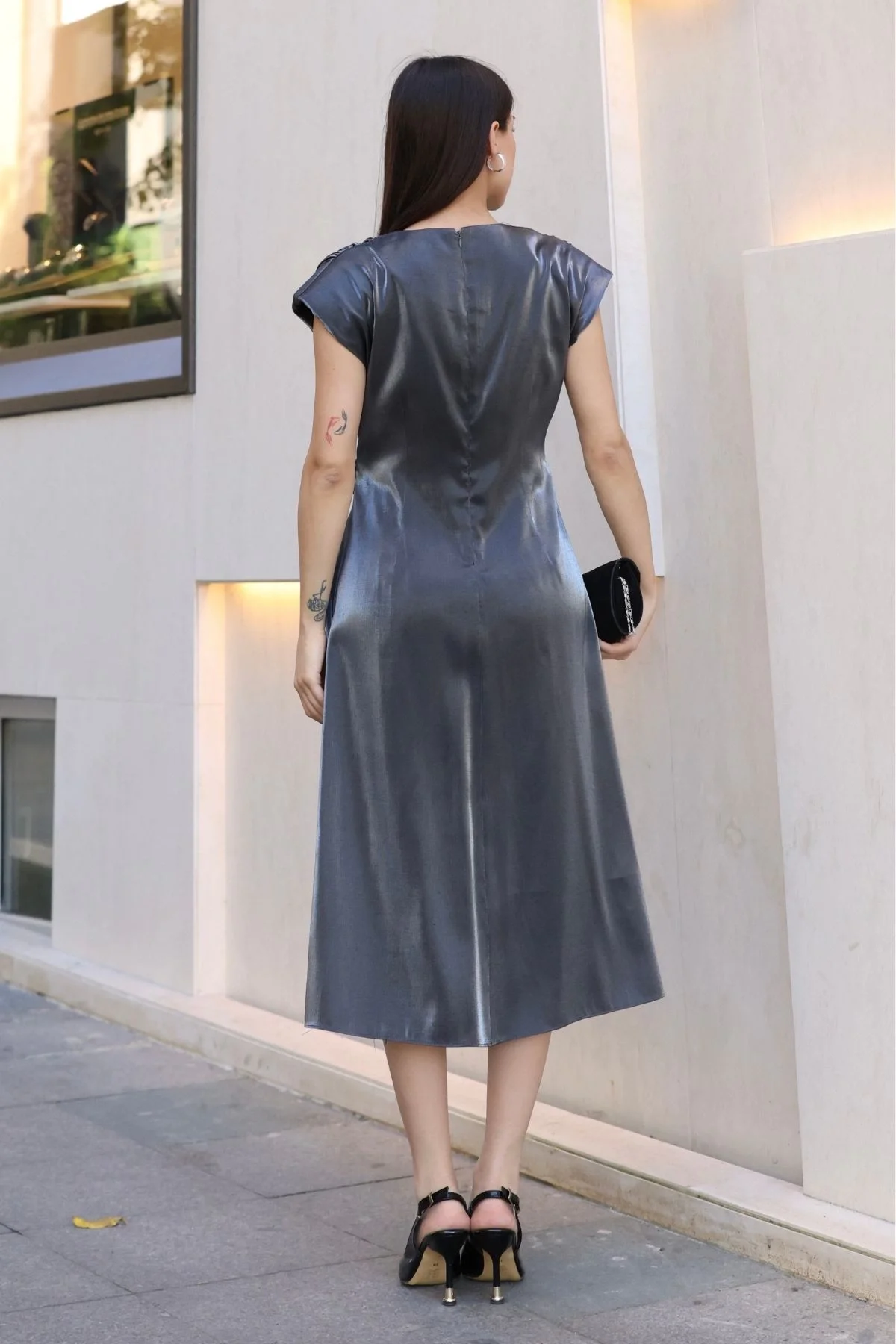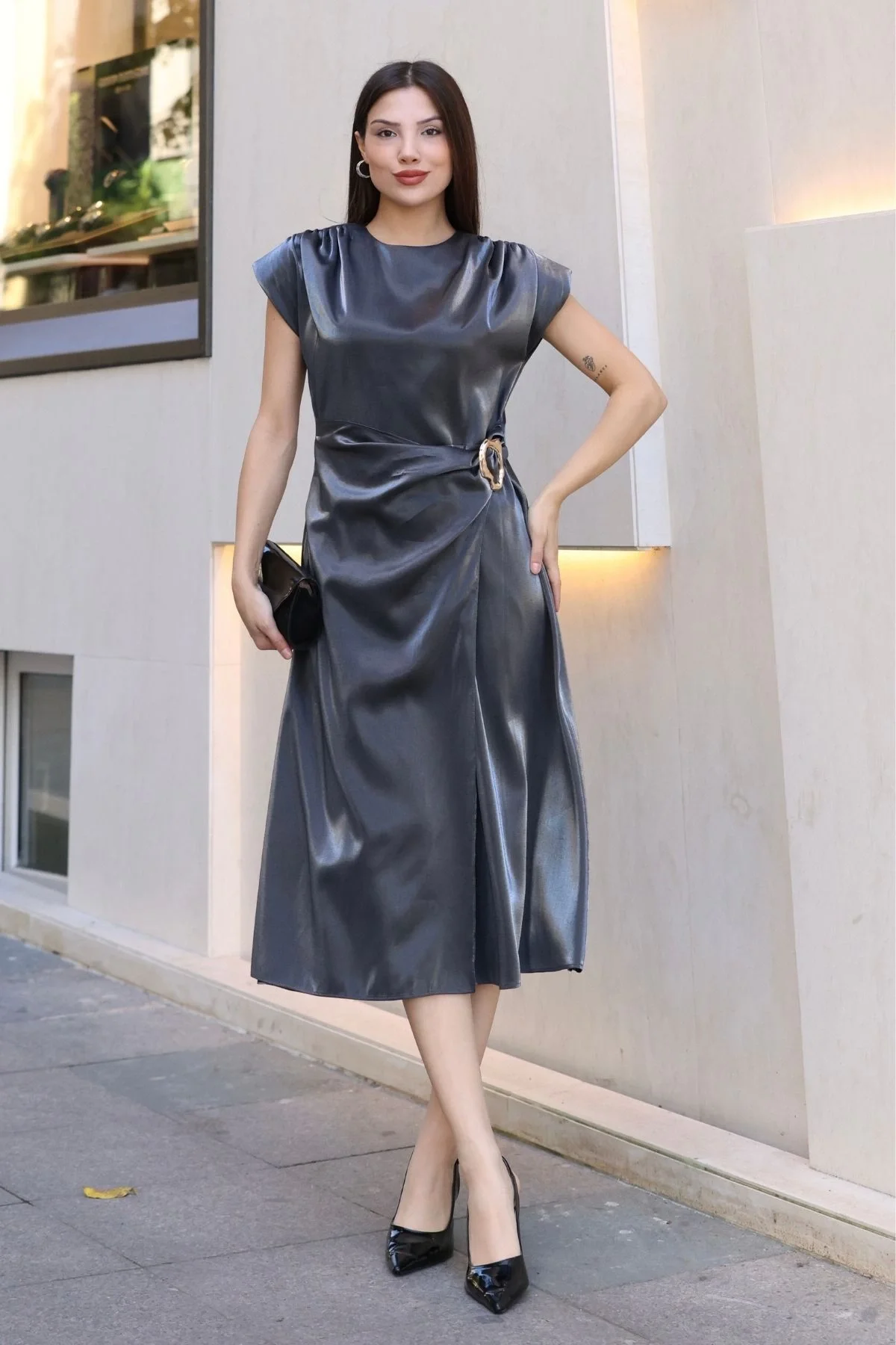 Toka ve Drape Detaylı Soft Saten Midi Elbise 6042-Antrasit
