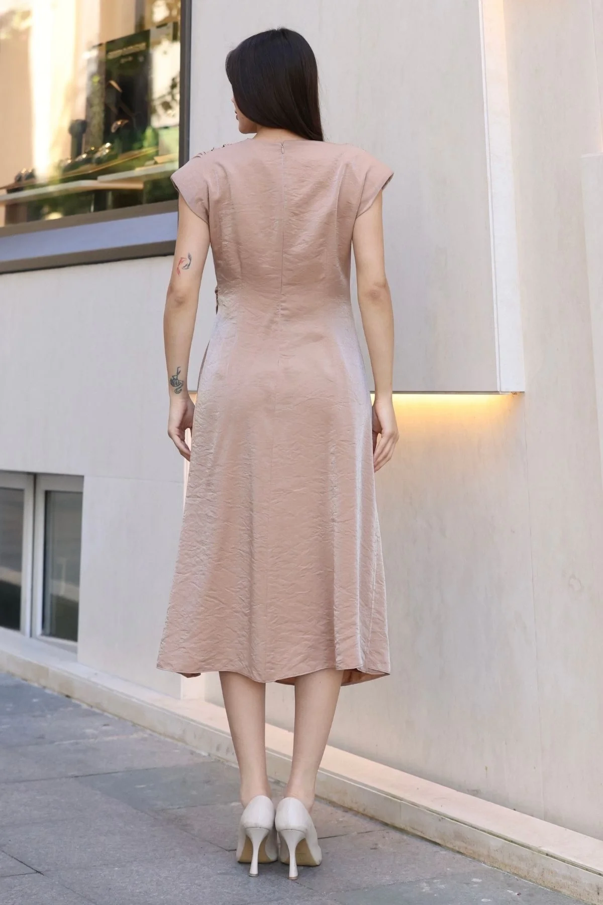 Toka ve Drape Detaylı Soft Saten Midi Elbise 6042-Bej