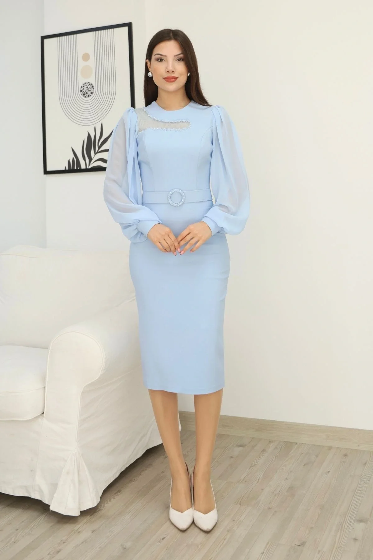 Tül ve İşleme Detaylı Midi Elbise 2285-Bebe Mavisi