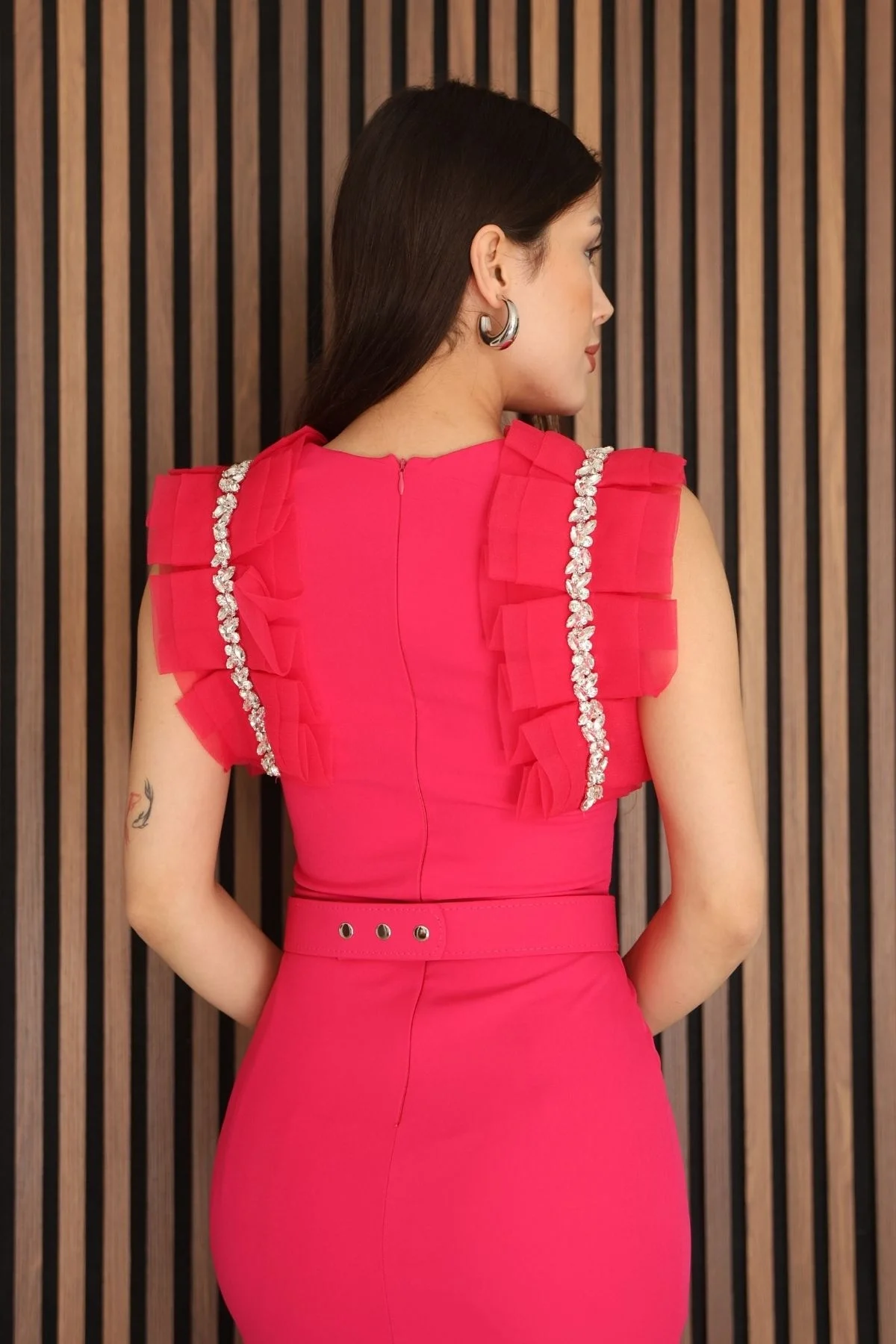 Tül ve Taş Detaylı Kemerli Midi Elbise 2248-Fuşya