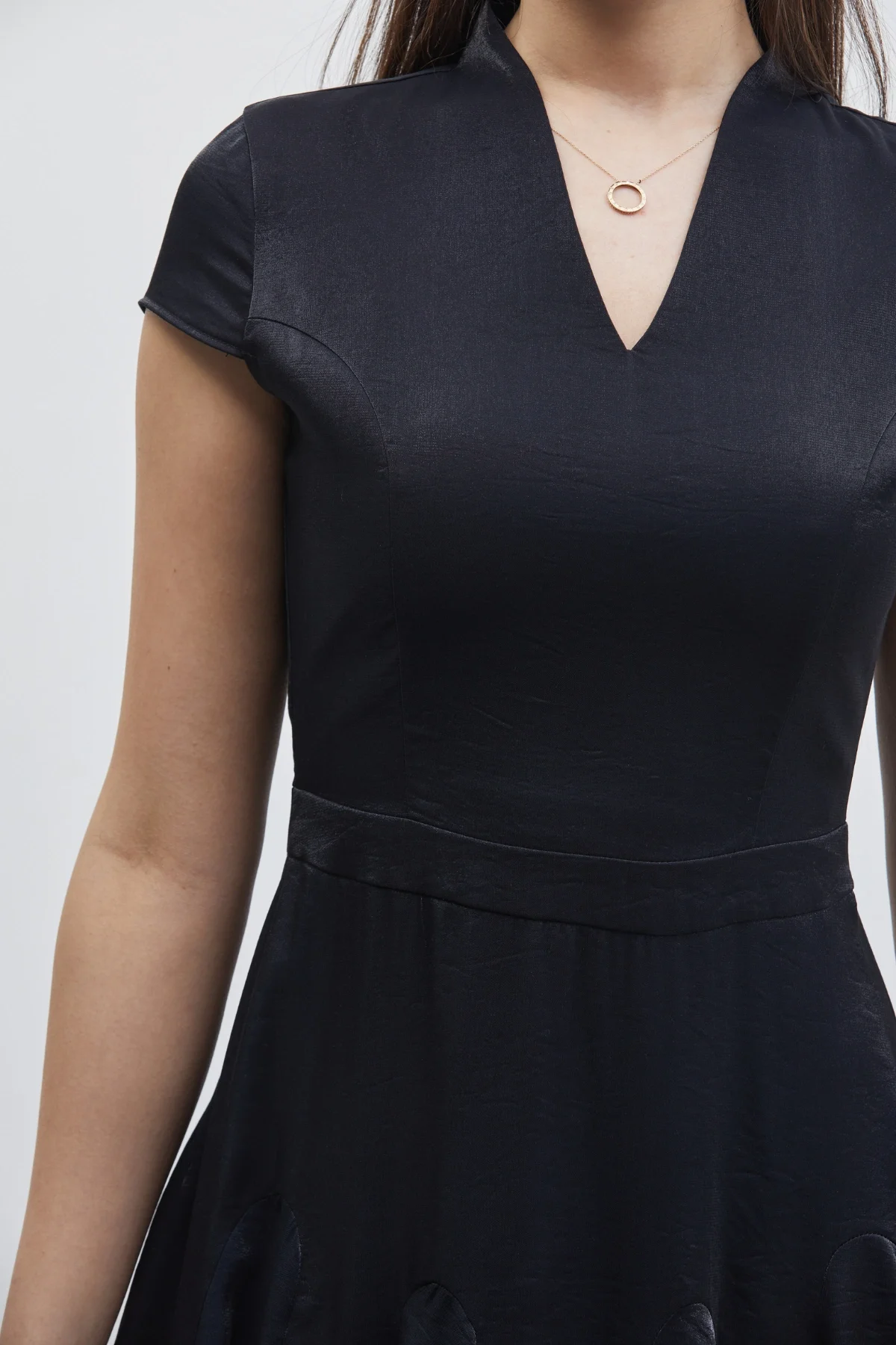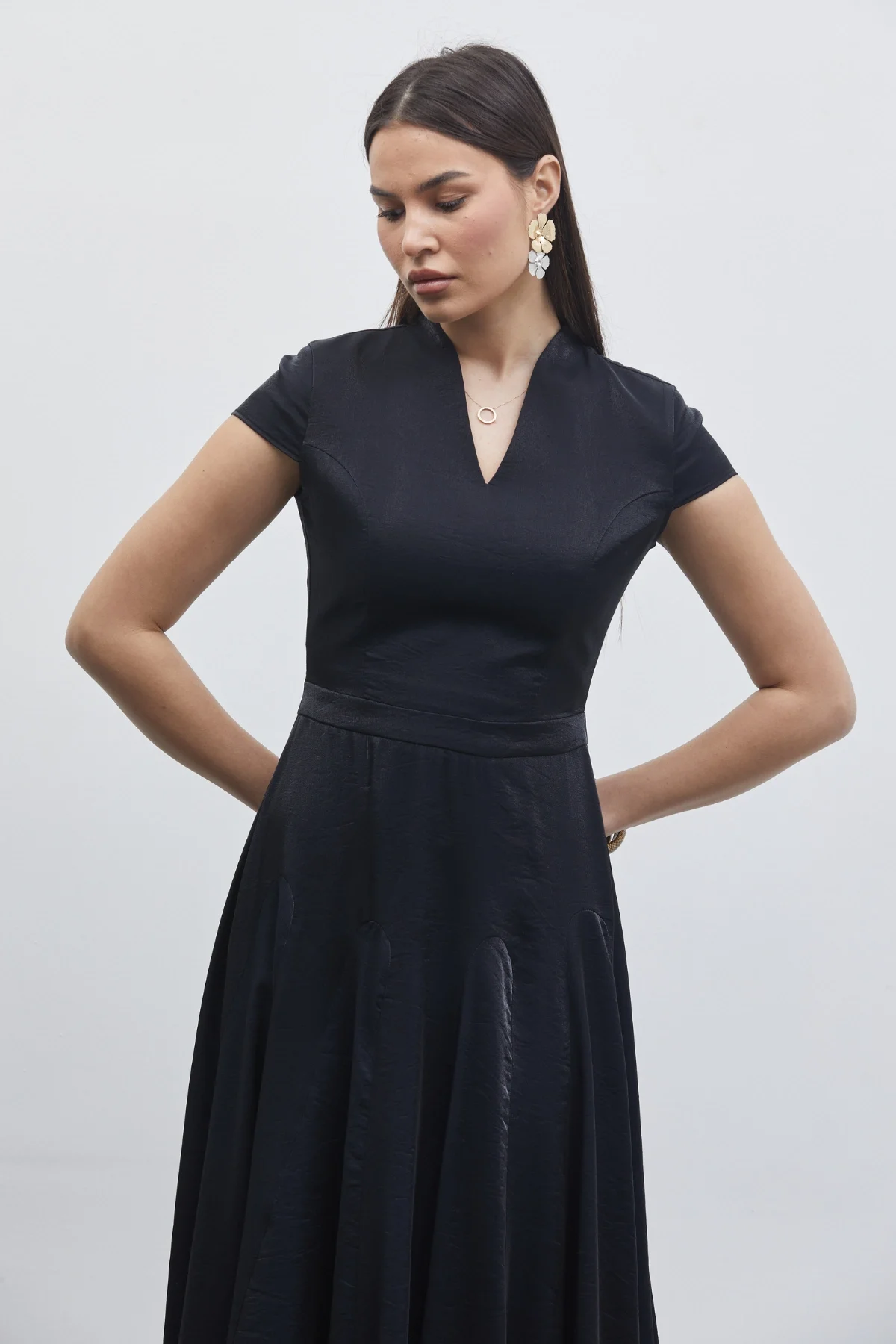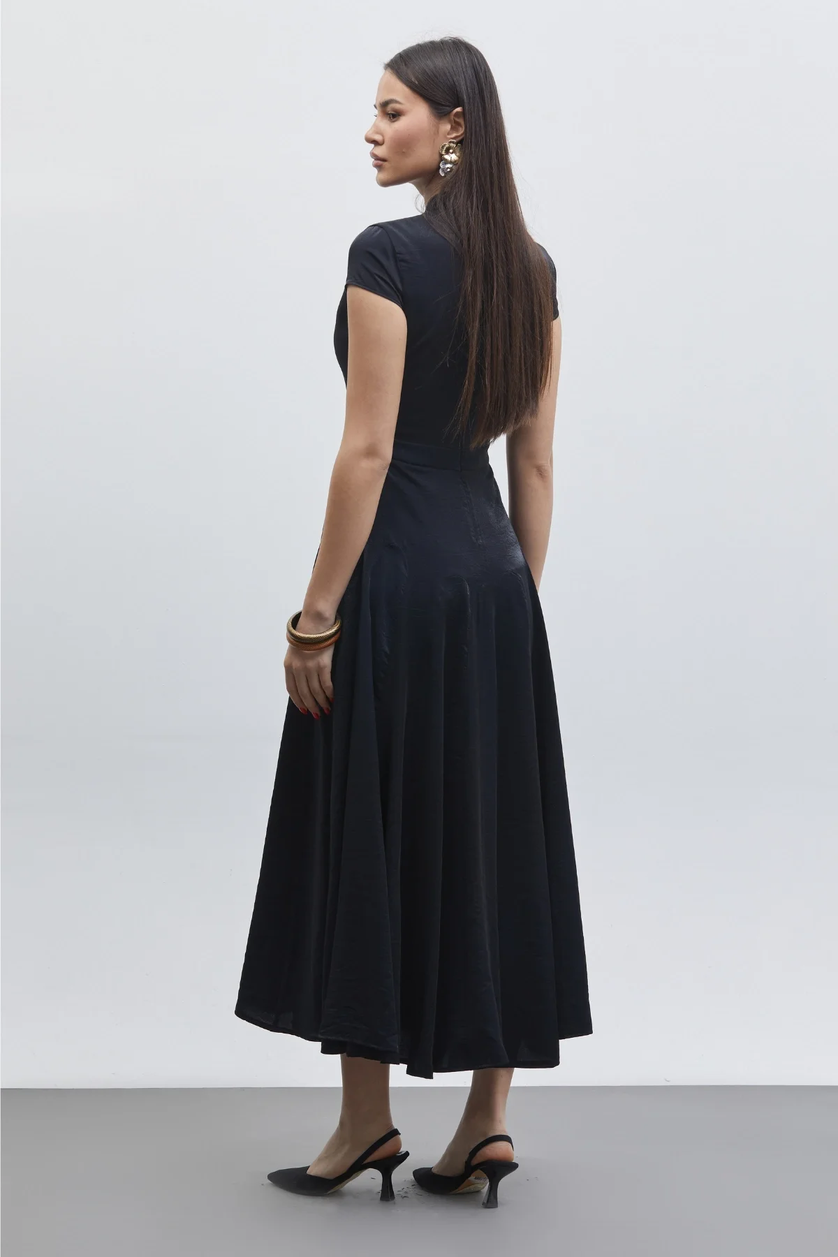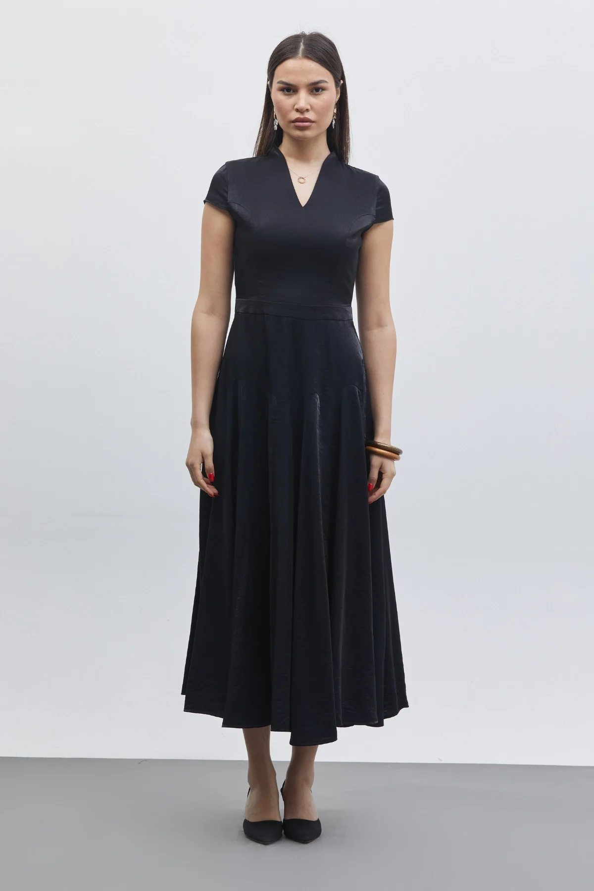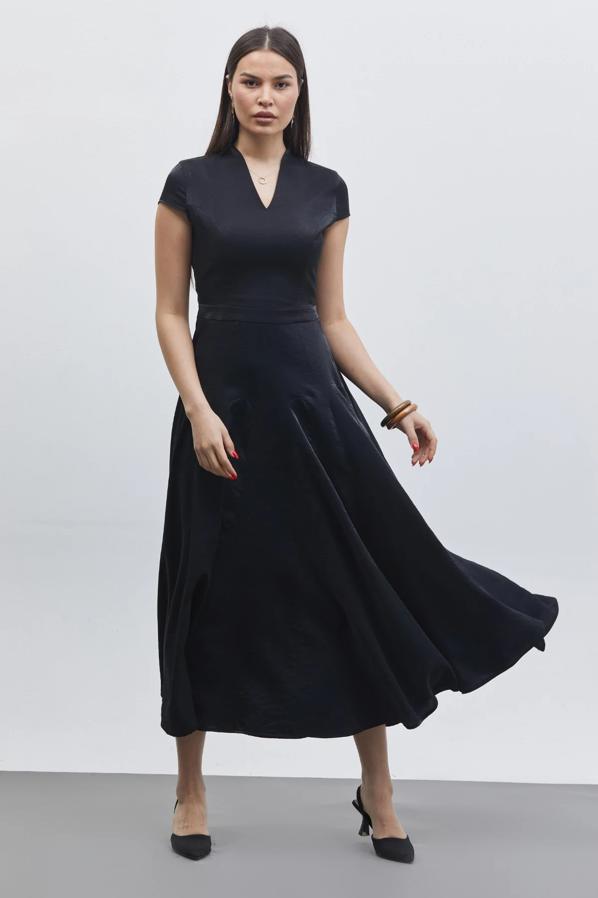 V Yaka Etek Detaylı Midi Elbise 6086-Siyah