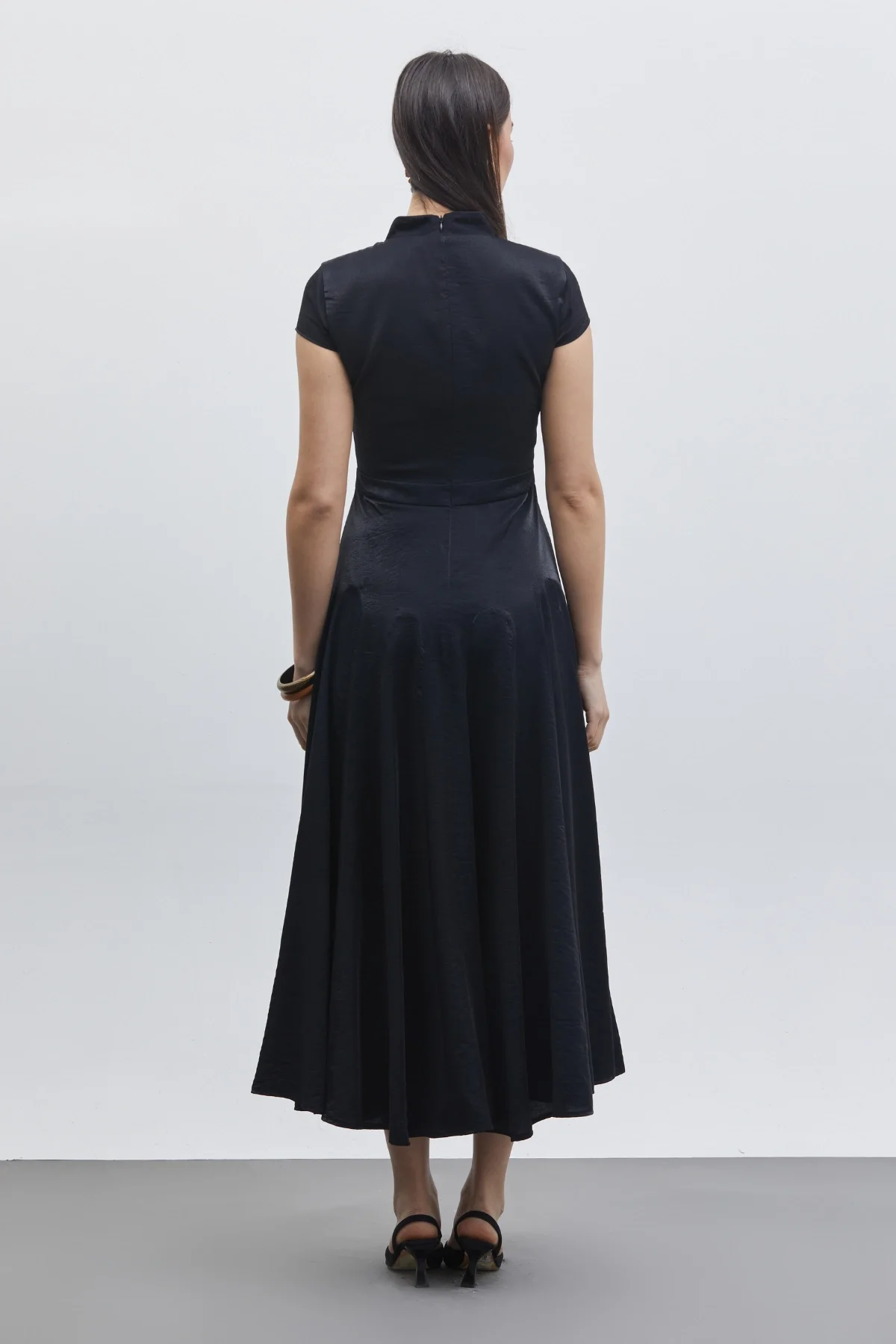 Akışkan floş viskon dokusuyla öne çıkan bu elbise, iki parça halinde kurgulanan etek detayıyla hareketli ve özgün bir siluet sunar. İncelikle form verilen bel hattı ve hacimli etek kurgusu, modern ve dengeli bir siluet yaratır. tasarımdaki parça geçişleri modele mimari bir karakter kazandırır. Günün her anına uyum sağlayan zamansız bir parça olarak gardırobun güçlü tamamlayıcılarından biridir.