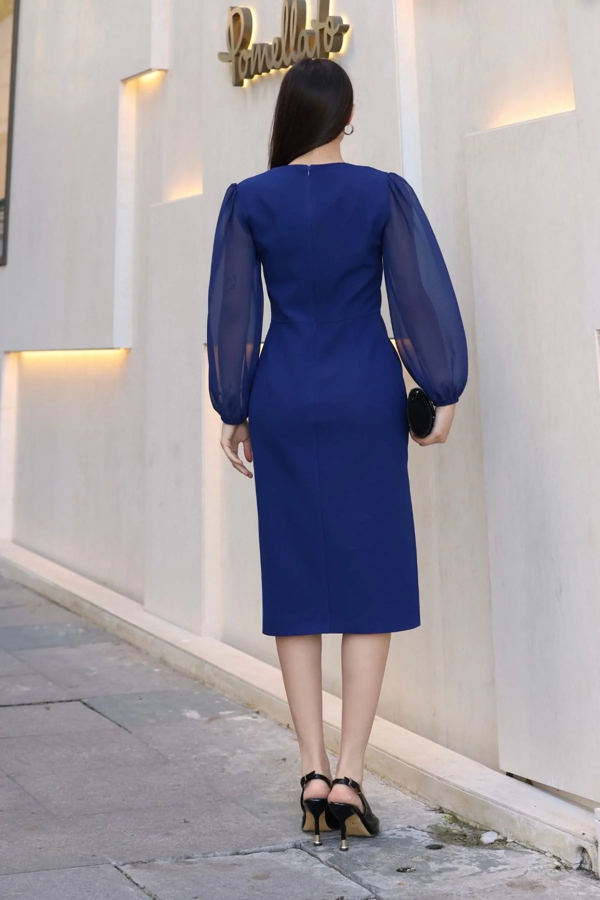 V Yaka Şifon Kollu Yırtmaçlı Midi Elbise 6015-Lacivert