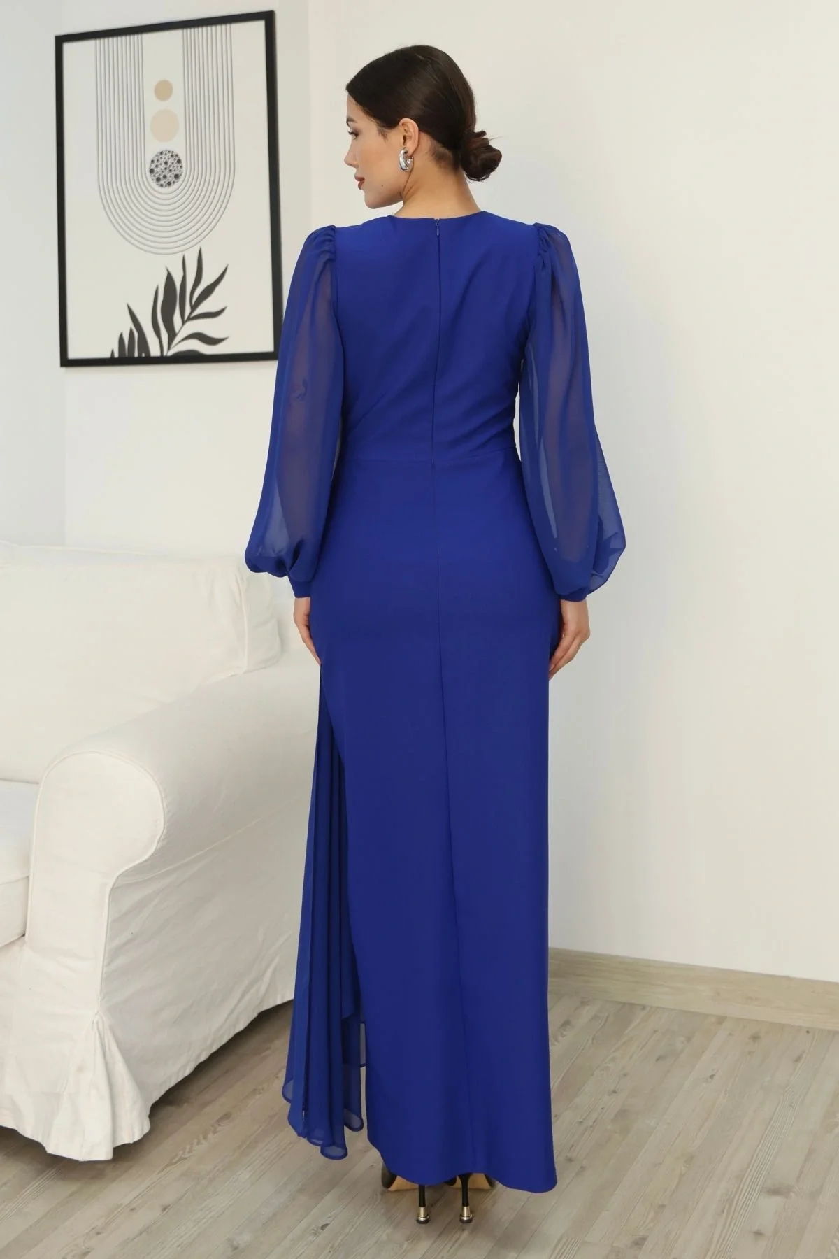 • Bel kısmında başlayıp eteğe doğru inen, zarif hareket sağlayan büzgülü şifon parça detayı.